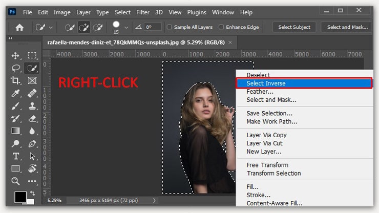 Only use the above method if you have the older version. All you have to do is to open your image in Adobe Photoshop. Then right click of your mouse will open a dialog box. Then click Select Inversion. You can try this method multiple times. It will be necessary for perfection.