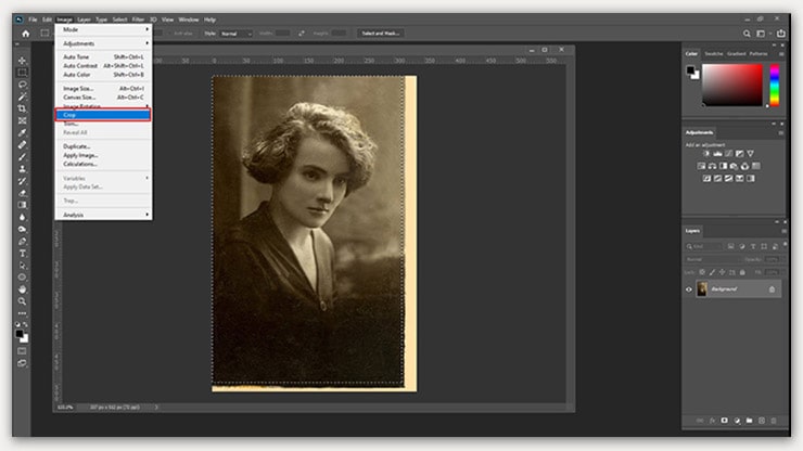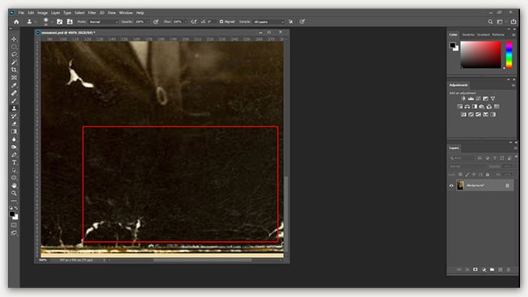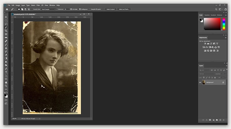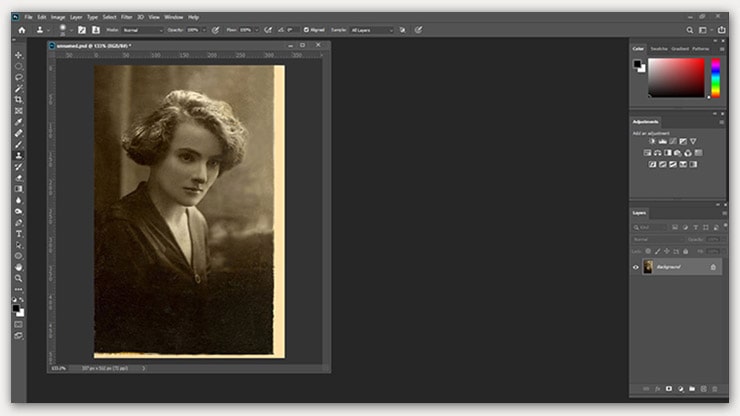 After you receive an image from a customer, scan it first. Open the image in Photoshop. The damage assessing process will let you make a plan to restore photos.