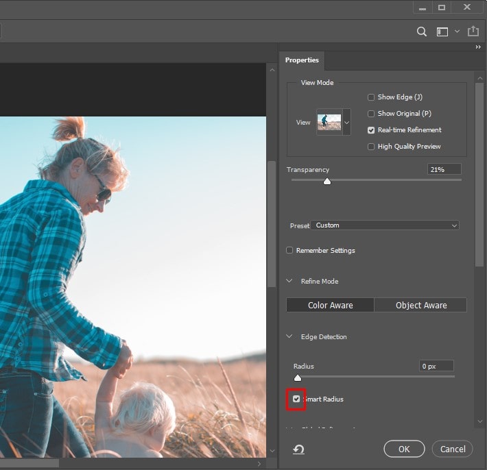 Use the Refine Edge tool sparingly. Only when the effect is needed. For instance, use it for large-sized, high-resolution photographs. Otherwise, use a sharpening filter instead.